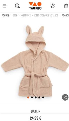 Ce produit est extrait d'une liste de naissance déposée sur Kadolog. Kadolog permet de créer des listes de naissance en toute liberté. Il est possible d'ajouter toutes vos envies cadeaux et de recevoir les dons directement sur votre compte. Avec les dons reçus, vous êtes alors libre d'aller acheter vos produits (comme ce 'Peignoir oreilles de lapin ') où et quand vous le souhaitez.