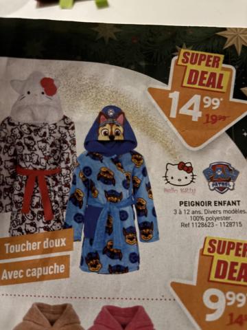 Ce produit est extrait d'une liste de cadeaux (Anniversaire, Noël, ...) déposée sur Kadolog. Kadolog permet de créer des listes de cadeaux (Anniversaire, Noël, ...) en toute liberté. Il est possible d'ajouter toutes vos envies cadeaux et de recevoir les dons directement sur votre compte. Avec les dons reçus, vous êtes alors libre d'aller acheter vos produits (comme ce 'Peignoir pat patrouille ') où et quand vous le souhaitez.