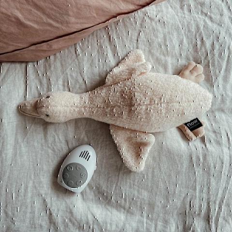 Une peluche douce comme de la s(oie) qui diffuse différents sons rassurants, appelés bruits blancs, ainsi que des berceuses pour apaiser les minis et les aider à trouver le sommeil.rechargeable.