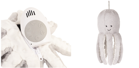 Olly Comforter est une jolie et douce pieuvre faite pour réconforter les tout-petits. Grâce à un petit boitier, elle émettra des sons qui sauront rassurer et apaiser bébé (cours d'eau, battements de cœur ou mélodies).