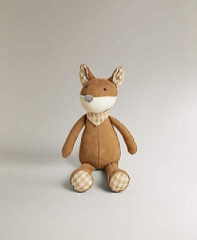 Renard en peluche avec applications brodées, foulard noué au cou et imprimé vichy sur les oreilles et les pattes 🐾