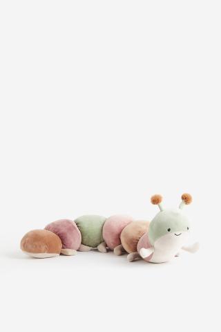 Grande peluche en velours très doux. Modèle en forme de chenille avec yeux et bouche brodés, et antennes surmontées de pompons. Longueur 80 cm environ.