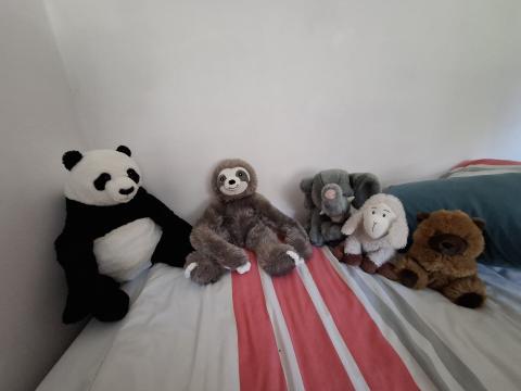 Panda, paresseux, castor... pour lui tenir compagnie; trouvées pour rien au magasin Terre à Ciney.