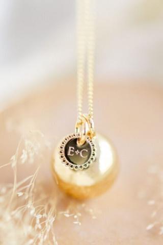 Personnalisez votre bola de grossesse avec notre médaille Perlée au contour délicatement travaillé. Cette dernière se personnalise avec vos précieux mots doux.