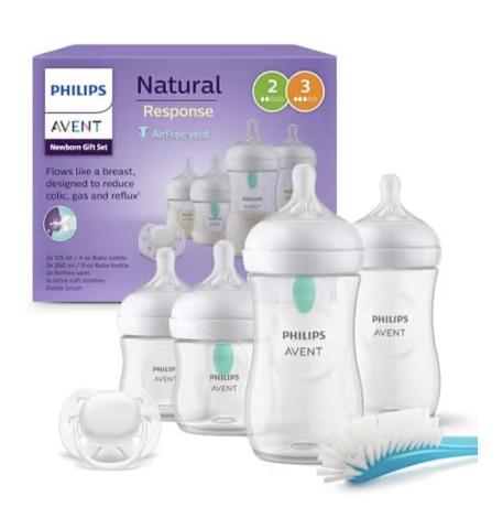 Philips Avent Kit biberons avec valve AirFree pour nouveau-né – 4 biberons à Réponse Naturelle, sucette ultra-douce et goupillon pour les bébés âgés de 0 à 12 mois (modèle SCD657/11)
