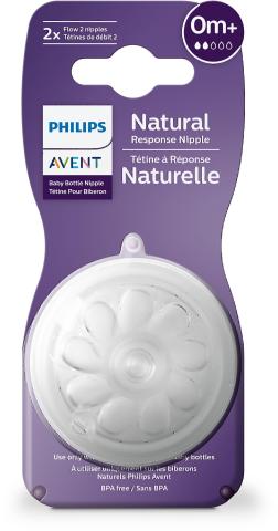 Tétine à réponse naturelle conçue pour s'adapter au débit du nouveau né (2 trous). La tétine laisse le lait s'écouler seulement quand le bébé boit ce qui permet au bébé de boire comme au sein.