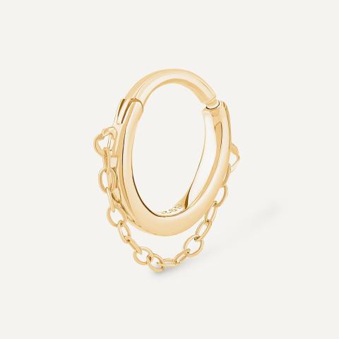 Fine créole en Argent 925 doré à l'Or 24 carats. Ce piercing anneau, agrémenté d'une fine chaînette pour plus de mouvement et d'élégance, offre une superbe alternative à l'anneau traditionnel.