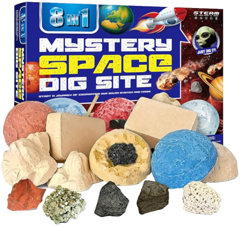 Bloc en plâtre contenant une pierre à extraire. Oscar a déjà reçu un kit avec un dinosaure sur le même principe.