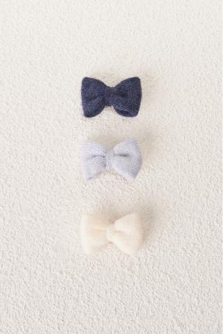 Trois petites pinces type crocodile. Nœuds en maille, doublés, assortis à la collection. Taille du nœud: largeur 5,5 cm; hauteur 4 cm. Taille de la pince : 4,5 cm.