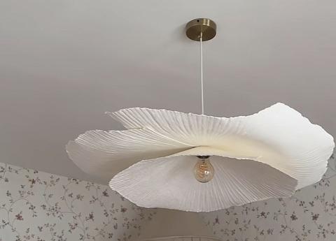 Lampe de plafond en papier avec double feuille de couleur écru et détail doré.