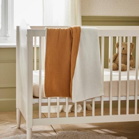 1 face en gaze de coton, 1 face en micro-polaire. Plaid tout doux pour réchauffer les tout-petits dans le lit, le cosy ou la nacelle. Double gaze de coton et micro-polaire 100% polyester.