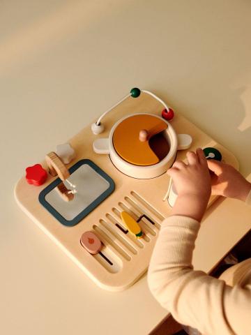 Un tableau d'activité en bois ludique qui invite les petits chefs à remuer, secouer et faire revenir leurs créations gr