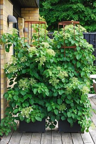 Plantes grimpantes en pot pour habiller notre terrasse et créer une séparation avec les voisins. A choisir en pépinière, plutôt des clématites qui aiment l'ombre. Avec un joli pot style Ecopot brun.