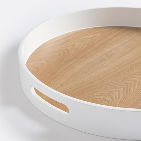 Belles dimensions, bord bien haut et poignées intégrées. Nicolo, le très grand plateau tout en bois certifié FSC®, est particulièrement pratique au quotidien. Plaqué frêne et bord laqué blanc.