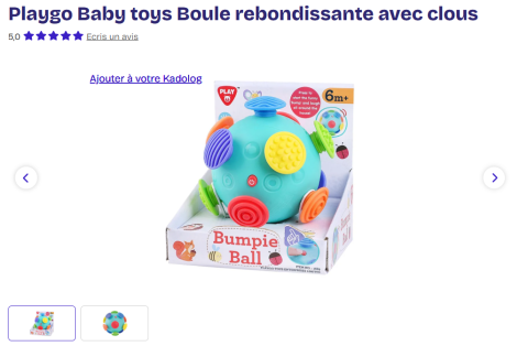 Ce produit est extrait d'une liste de cadeaux (Anniversaire, Noël, ...) déposée sur Kadolog. Kadolog permet de créer des listes de cadeaux (Anniversaire, Noël, ...) en toute liberté. Il est possible d'ajouter toutes vos envies cadeaux et de recevoir les dons directement sur votre compte. Avec les dons reçus, vous êtes alors libre d'aller acheter vos produits (comme ce 'Playgo Baby toys Boule rebondissante avec clous ') où et quand vous le souhaitez.