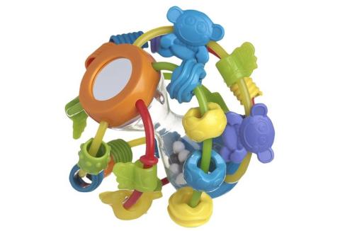 La balle Learn & Play de Playgro aux couleurs vives déborde de formes et de matières : billes tintantes, perles, anneaux de dentition, miroir, etc.