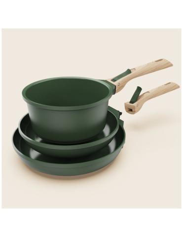 (Couleur Moka) Découvrez la batterie de cuisine Poêles et Casserole COOKUT avec ses 2 poignées amovibles et ses 2 feutrines. Sans PFAS. Compatibles tous feux + four.
