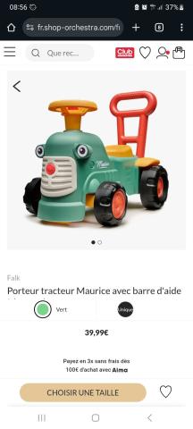 Ce produit est extrait d'une liste de cadeaux (Anniversaire, Noël, ...) déposée sur Kadolog. Kadolog permet de créer des listes de cadeaux (Anniversaire, Noël, ...) en toute liberté. Il est possible d'ajouter toutes vos envies cadeaux et de recevoir les dons directement sur votre compte. Avec les dons reçus, vous êtes alors libre d'aller acheter vos produits (comme ce ' Porteur tracteur Maurice avec barre d'aide à la marche | Falk ') où et quand vous le souhaitez.