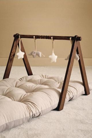 Structure de portique d'activités pour bébé fabriquée en bois de frêne, résistante et au design élégant. La structure comprend une barre pour suspendre des jouets.