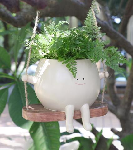 Une petite planche de bois, un pot en résine avec un effet tout lisse, et quelques cordelettes font office de balançoire pour ces pots de fleurs en manque de sensations. ðª´