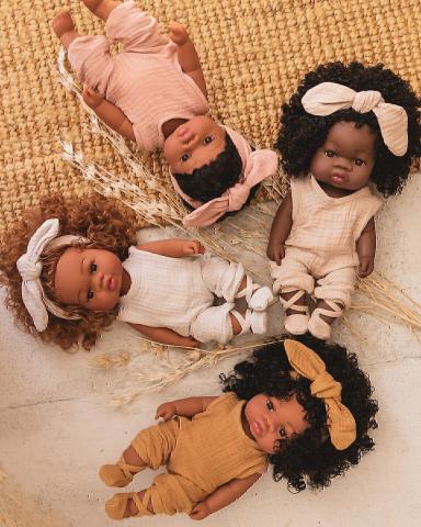 Chaque poupée comprend un ensemble de sous-vêtements, un bandeau, une combinaison et une paire de chaussures fabriquées à la main au Portugal en tissu 100% gaze de coton.