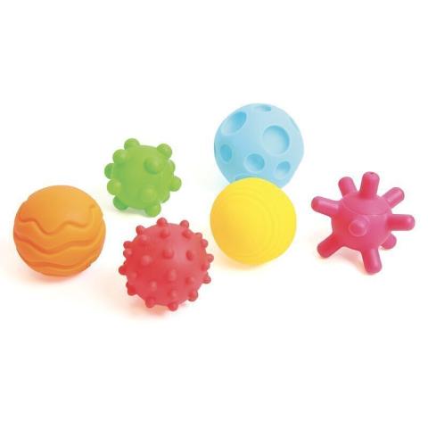6 petites balles colorées offrant chacune une surface tactile distincte : nervures, rainures, picots, cratères, creux, renflements… Pressez-les, elles émettent un léger sifflement. Légères et faciles à manipuler. Sans BPA, latex ni phtalates. Diam. moyen 7,4 cm. Dès 6 mois.