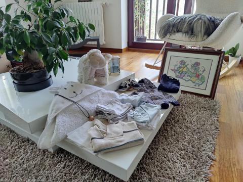 Conjunto de prendas de ropa y peluche para nuestro peque. Cuadro hecho a mano para adornar de forma original la habitación de nuestro peque.
