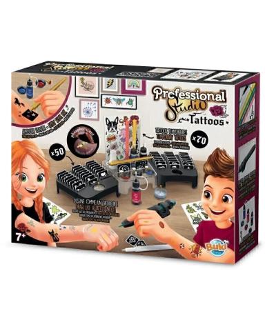 PROFESSIONAL STUDIO TATOOS Une station pour dessiner et appliquer toutes sortes de tatouages temporaires. Inclus: planches de tatouages, feutres cosmétiques...