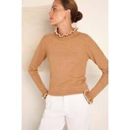 Coupe classique et intemporelle. Encolure ronde avec collerette. Finition bord-côtes et volants au col et aux poignets. Maille moelleuse et délicate, douce au toucher et très agréable à porter.