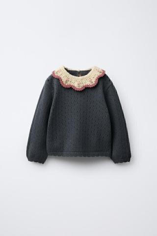 Pull en maille avec col Claudine en tissu crochet avec détail fleurs brodées et manches longues. Fermeture avec bouton goutte d'eau dans le dos.