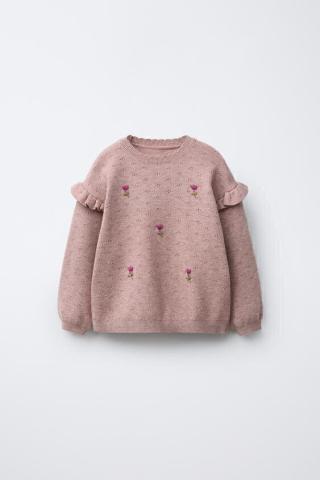 Pull en maille à col rond et manches longues. Volant appliqué sur l'épaule. Détail de fleurs brodées sur le devant.