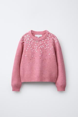Pull en maille à col rond et manches longues. Paillettes appliquées sur le devant, ton sur ton.