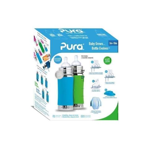 Pura - 2 biberons évolutifs inox 325ml 3-18 mois vert turquoise