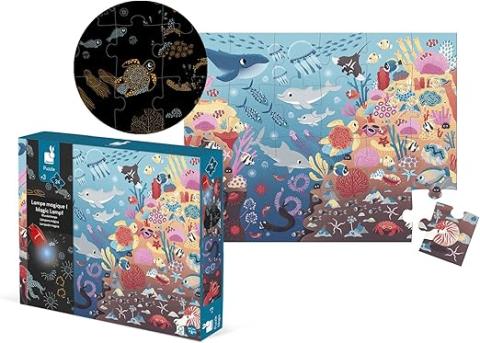 PUZZLE 2-en-1 : après avoir reconstitué son puzzle de 24 pièces (à l'aide du poster modèle inclus), l'enfant pourra explorer les profondeurs des océans grâce à sa lampe magique (fournie) qui fera apparaître nombre de détails !