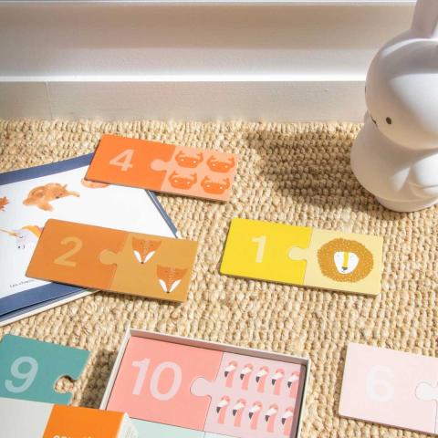 Cinq puzzles à l’effigie d’animaux à assembler, de 2 à 6 pièces chacun.