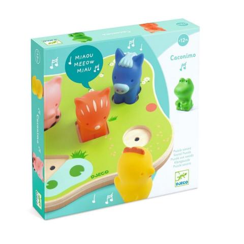Caconimo est un puzzle sonore avec 5 animaux de la ferme en volume et un plateau de bois. L'enfant joue avec les animaux et découvre leur cri.