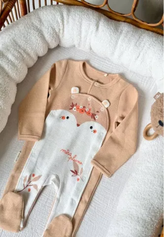 Dans une jolie matière appelée nid d'abeille, bébé sera bien au chaud dès ses premiers jours. Avec son ouverture pont, notre pyjama va faciliter le change