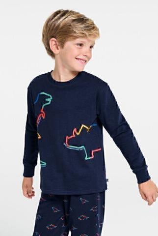 Des dinosaures colorés se joignent à la nuit pour bien dormir : les garçons sont ravis ! Ce modèle en velours doux est composé de deux pièces : un haut imprimé (col rond, manches longues) et un pantalon coordonné (coupe jogging, taille élastiquée).