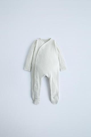 Pyjama avec col en V et manches longues avec possibilité de moufles. Fermeture par boutonnage-pression croisé sur le devant.