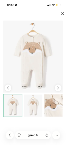 Ce produit est extrait d'une liste de naissance déposée sur Kadolog. Kadolog permet de créer des listes de naissance en toute liberté. Il est possible d'ajouter toutes vos envies cadeaux et de recevoir les dons directement sur votre compte. Avec les dons reçus, vous êtes alors libre d'aller acheter vos produits (comme ce 'Pyjama en velours ouvert devant motif renard bébé garçon beige | GEMO ') où et quand vous le souhaitez.