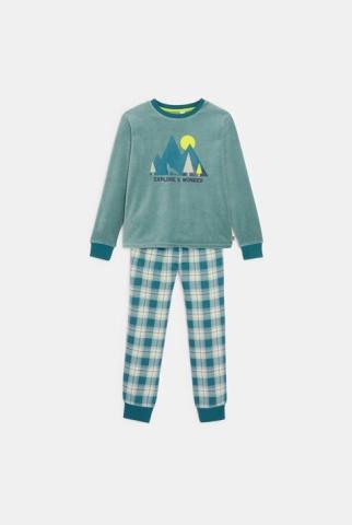 Pyjama garçon vert parfait pour des nuits douces et confortables ! Le haut en velours est à manches longues et présente un motif de montagnes, idéal pour rêver d'aventures. Le pantalon à carreaux en flanelle ajoute une touche classique et élégante. Idéal pour un usage quotidien et facile à enfiler pour un maximum de confort.