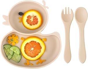 Qshare Assiette pour bébé - Antidérapante - Avec ventouses - Assiettes divisées et stables - Avec cuillère - Sans BPA - Passe au lave-vaisselle et au micro-ondes - Beige : Amazon.com.be: Bébé et Puériculture
