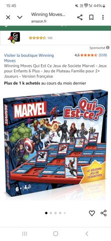 Ce produit est extrait d'une liste de cadeaux (Anniversaire, Noël, ...) déposée sur Kadolog. Kadolog permet de créer des listes de cadeaux (Anniversaire, Noël, ...) en toute liberté. Il est possible d'ajouter toutes vos envies cadeaux et de recevoir les dons directement sur votre compte. Avec les dons reçus, vous êtes alors libre d'aller acheter vos produits (comme ce 'QUI EST CE Marvel ') où et quand vous le souhaitez.