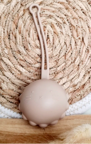Range tétine en silicone à accrocher partout. Un étui pour sucette en silicone durable et facile à nettoyer. Peut contenir jusqu’à 3 sucettes.