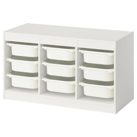 TROFAST combinaison structure + bacs, blanc/blanc, 99x44x56 cm Les enfants ont besoin de rangements spacieux pour leurs affaires. La série TROFAST est composée de caissons en bois, de rangements en filet et de bacs en plastique (min. 50 % recyclés). Facile à tirer vers soi, à transporter et à remettre en place.