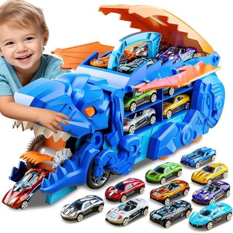 Esteopt Camion de transport - Jouet pour garçons de 3 à 4 5 6 7 ans - Portable - Dinosaure - Circuit de course - Avec 12 jouets dinosaures - Boîte cadeau : Amazon.com.be: Jouets