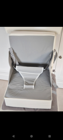 Rehausseur de chaise pour enfant, gris, ceinture de sécurité réglable, imperméable et transportable.