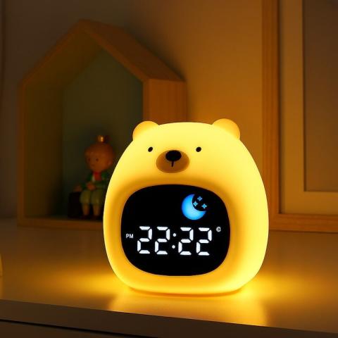 Veilleuse ours avec réveil, bruit blanc et lumière LED. Aide au sommeil dès 2 ans. Rechargeable. Cadeau enfant original & utile.