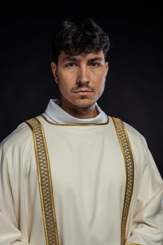 Cette dalmatique en tissu lisse, ornée de rayures dorées brodées de main de maître, est une pièce unique de vêtement liturgique. L'ensemble est fini avec une bordure en satin doré, ajoutant élégance et charme à ce vêtement liturgique. Caractéristiques principales : Broderie dorée : La broderie dorée donne à la dalmatiq