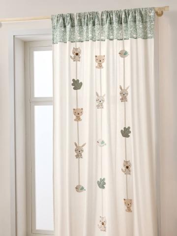 Un rideau tamisant qui invite à la rêverie et à la découverte de la nature. Une guirlande de personnages brodés autour du thème DANS LES BOIS, un tissu tamisant... tout est réuni pour créer une ambiance douce et cha